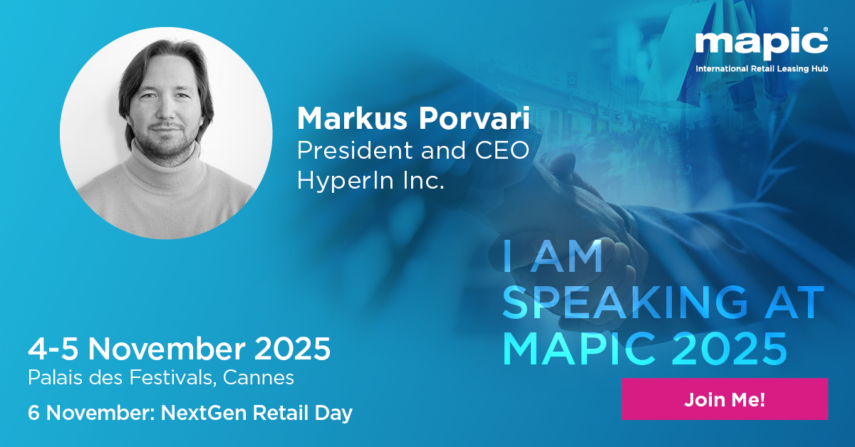 HyperIn CEO Markus Porvari will be speaking on ‘NextGen Retail’—sharing how technology plays a fundamental role in shaping the future of retail and mixed-use environments. Gain insights on how innovation, data, and digital solutions are redefining the way commercial real estate creates value.